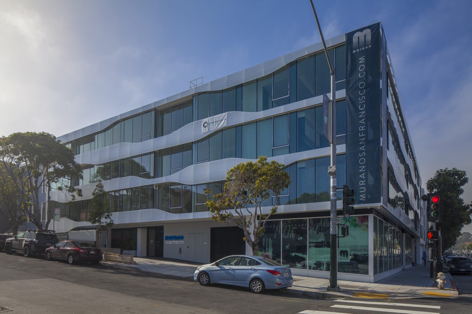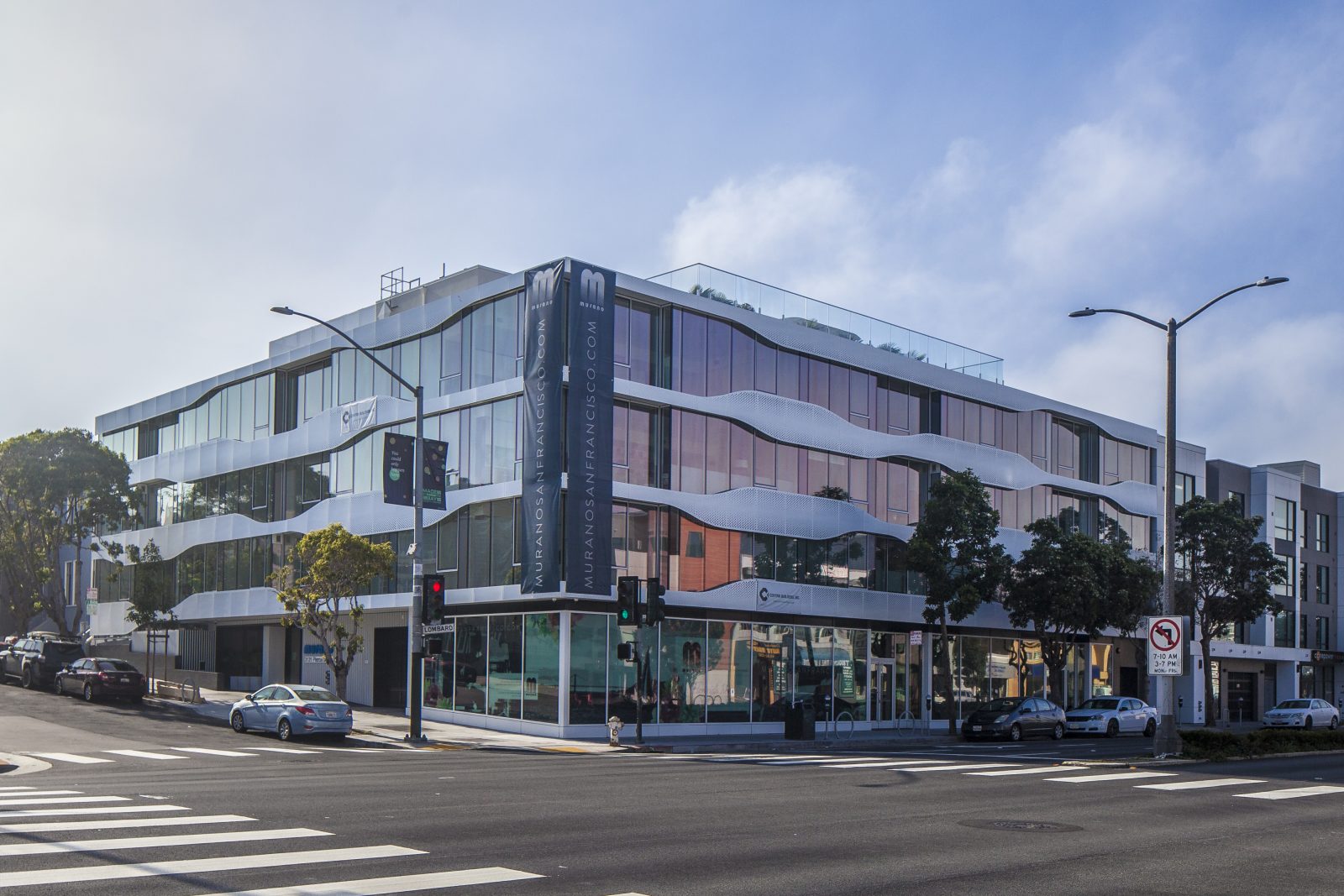 At the corner of Pierce and Lombard Streets, the ribbons of custom perforated aluminum panels on Murano’s facades represent the undulating movement through the surrounding neighborhoods. The five-story, concrete-framed building includes twenty-two condominiums with private balconies, a landscaped roof terrace, ground-floor retail, and one level of below-grade parking. SGH provided building enclosure consulting services for the project.