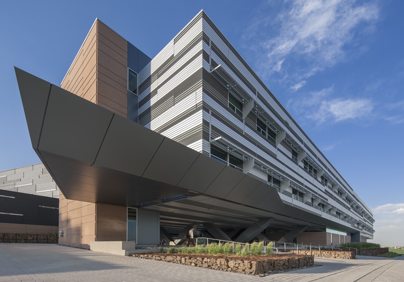 The design features a series of blocks clad in materials representative of the functions within. The architect chose reflective metal cladding for the elevated office block and used the smaller, darker data center block to link the offices to lab spaces. The lab block is clad in neutral-colored precast concrete panels to minimize the scale and tie into other campus structures. By providing building enclosure commissioning services, SGH supported the project goals to develop an energy-efficient structure. Highlights of our work include the following: