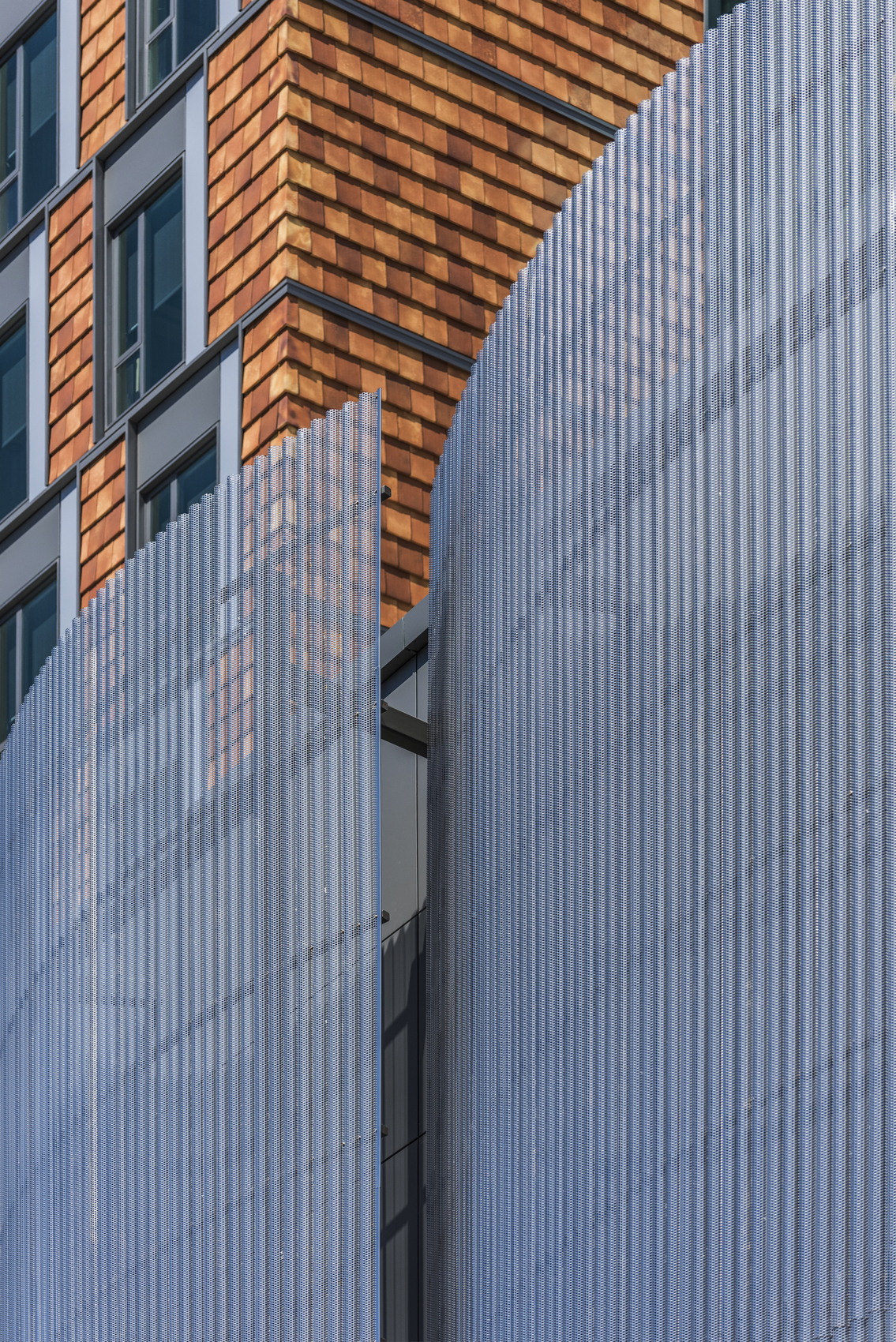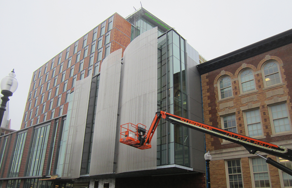 The New England Conservatory wanted to create a hub for students by providing gathering spaces, dormitories, a library, practice rooms, and performance venues all in one new building. The divided geometry and varying facades discretize the building into its many functions. Largely clad in terra cotta and aluminum-framed curtain wall, the building gives a nod to the conservatory’s long history and tradition while playing off the more modern lower levels. The lowest three levels use full-height glazing to provide views into these common areas and the performance center stands out as a feature space with its 40 ft tall metal screen. SGH provided building enclosure and building science consulting services for the project.