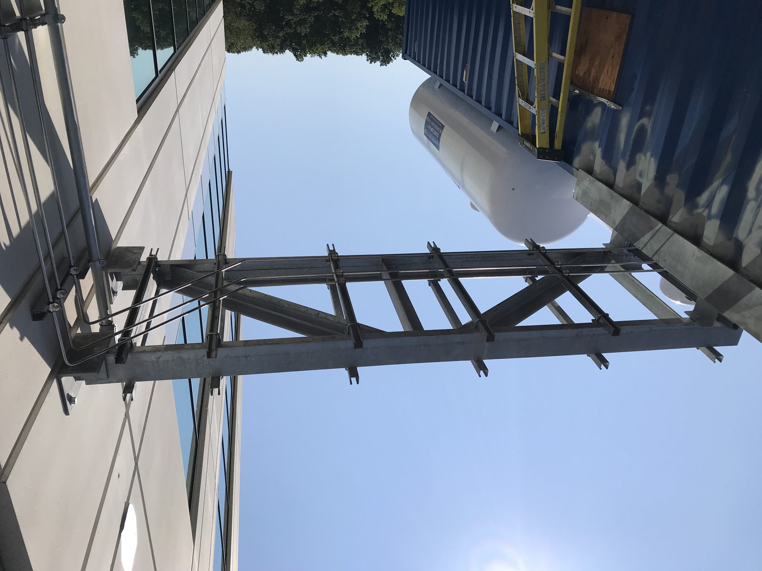- A steel-framed rack system to support horizontal runs of piping and ductwork between the building and an adjacent storage container for helium tanks, nitrogen tanks, and other laboratory operation support systems