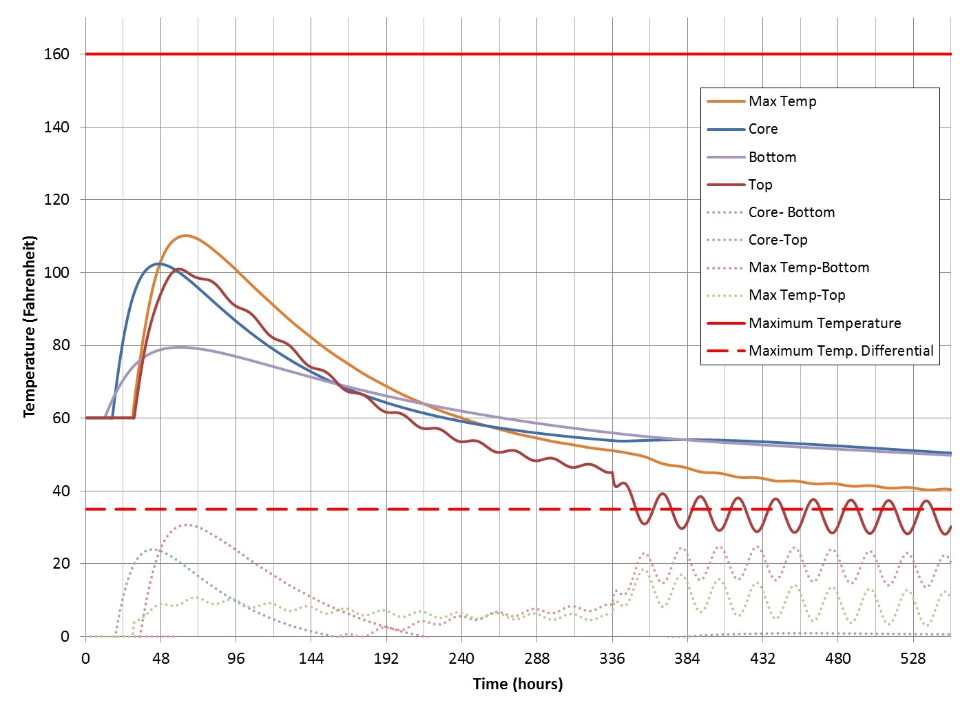 • Thermocouples installed in the mat foundation to measure temperatures after the mass concrete placement and verify that the measured temperatures were consistent with the SGH thermal model analysis