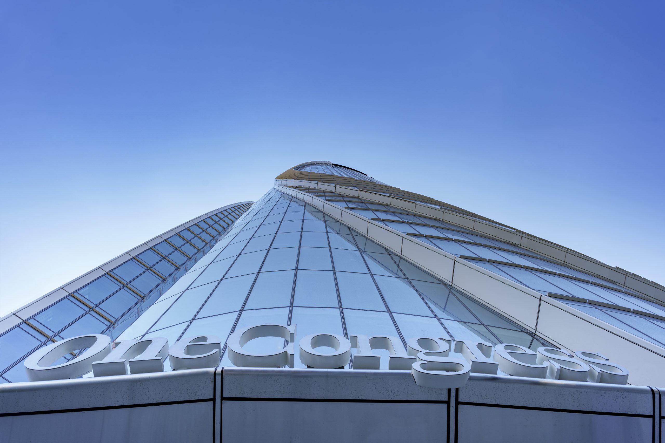 The striking office tower at One Congress will be an anchor for the Bulfinch Crossing development in downtown Boston. The 528 ft, forty‑three‑story building offers tenants many amenities, including a one-acre rooftop terrace and a three-story, glass-enclosed lobby. SGH consulted on the building enclosure design, which features a multiplane elliptical glass facade with integrated LED lighting and an 80 ft cantilevered sail.
