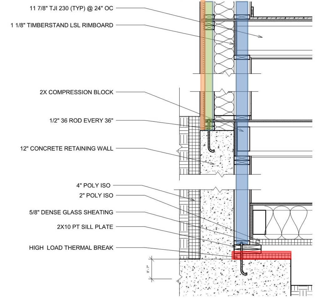 - Roof and floor sheathing that cantilevers over the interior stud wall, minimizing the thermal bridge to the exterior wall