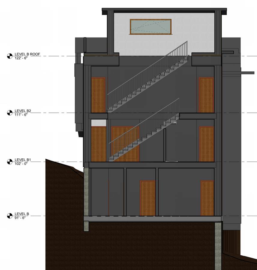 - Interior stud wall located inboard of the retaining wall, allowing for a thinner retaining wall and minimizing the volume of concrete