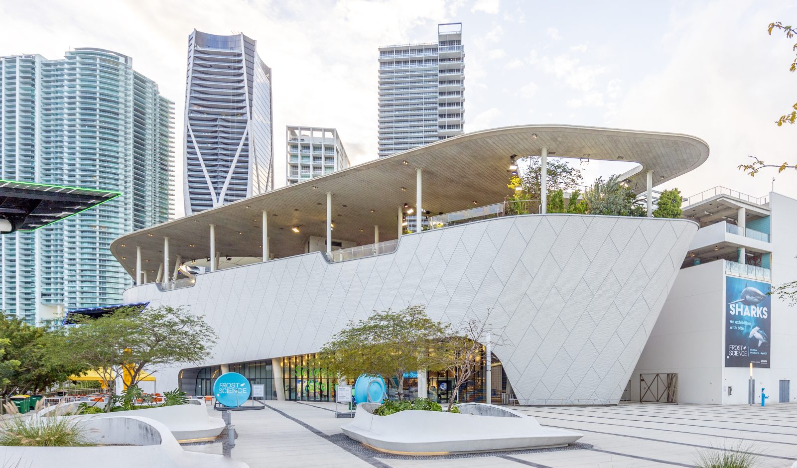 The new three-story Museum of Science is a living laboratory that invites visitors to learn about science and technology with an emphasis on South Florida’s culture and ecosystem. The 250,000 sq ft building features a Gulf Stream Tank within the Living Core building. Supporting over 500,000 gal of sea water, the elevated tank structure comprises an acrylic oculus to allow museum visitors to look into the tank from below. SGH consulted on the complex formwork for the 125 ft dia. conical, cast-in-place concrete Gulf Stream Tank.
