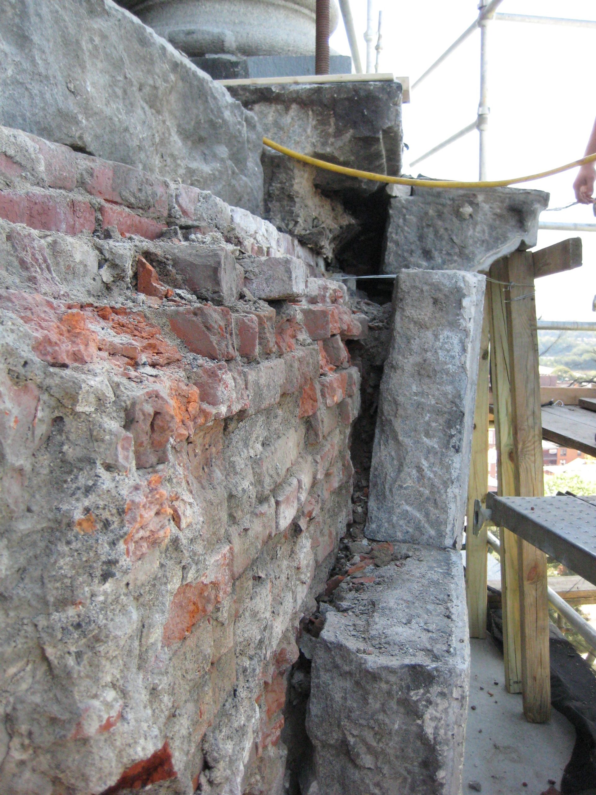 SGH designed comprehensive repairs to address leakage, which included reconstruction of the peristyle deck masonry. To address the masonry deterioration and resulting displacement, our solution incorporated concealed concrete beams and curbs that together served to support the granite pavers, while providing a substrate for anchoring the balustrades, and copings. The reconstruction involved lifting, storing, and resetting the existing granite pavers on the new concrete curbs to allow air movement under the pavers, which promotes drying of the saturated brick masonry below.