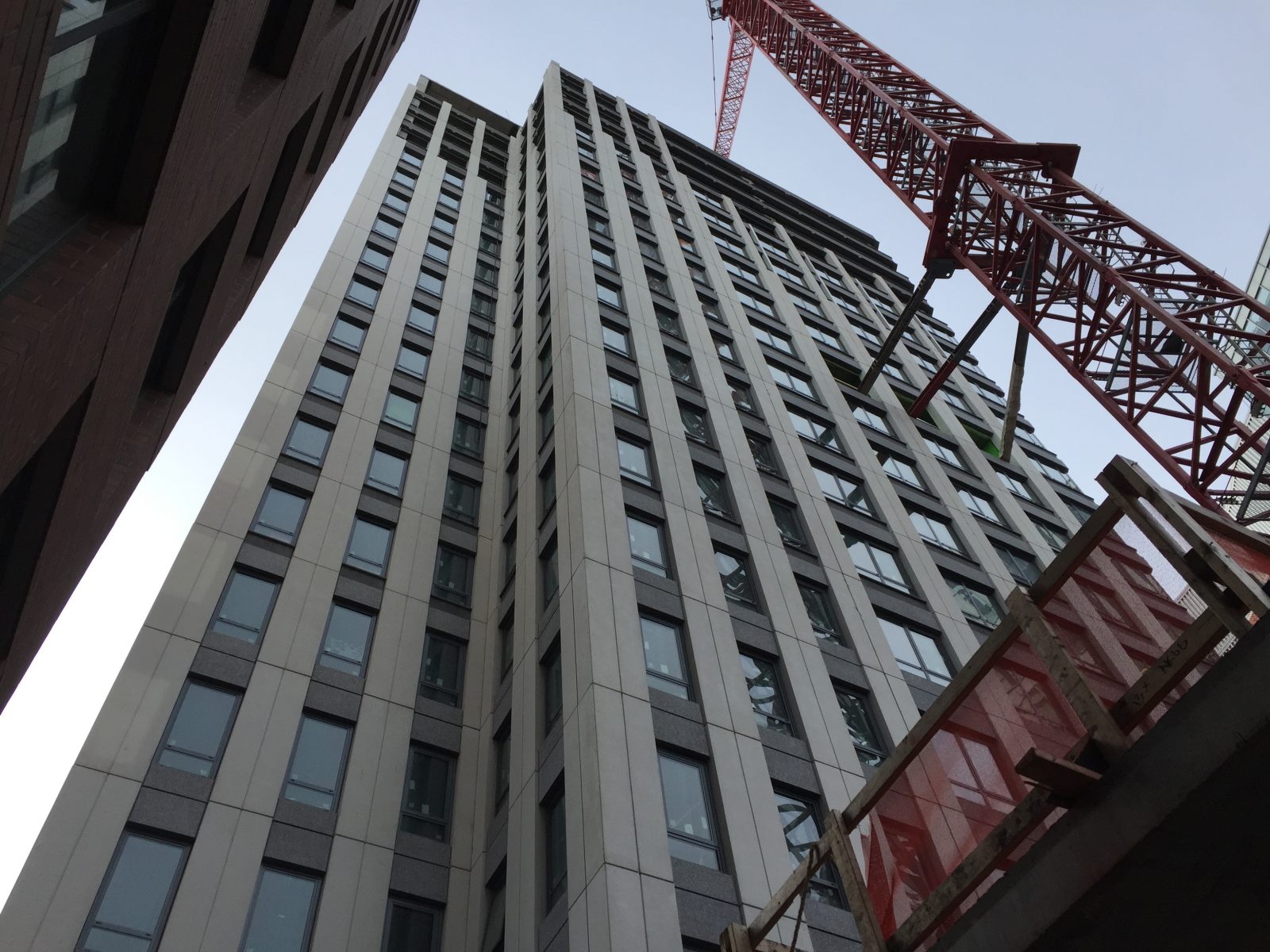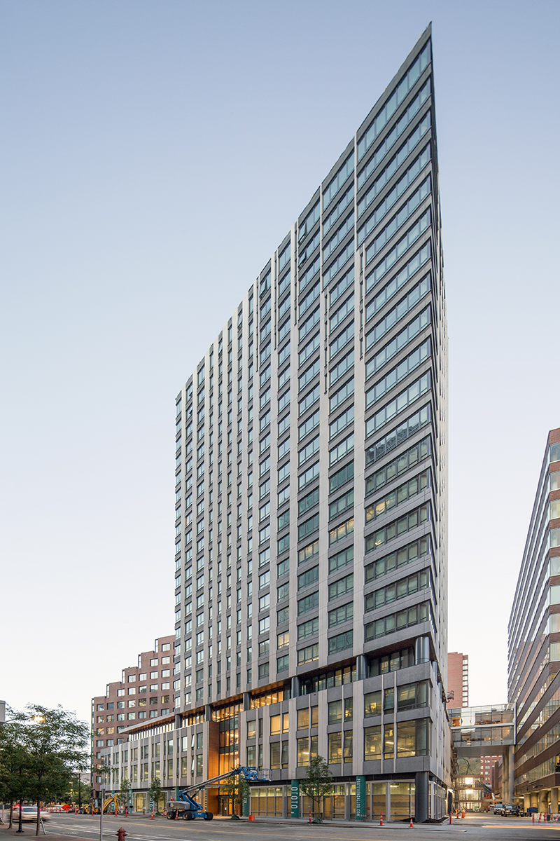Located at 88 Ames Street, Proto is a twenty-two-story, mixed-use residential tower in Cambridge’s Kendall Square, which has become known as a hub for science and research. Proto’s 280 units are primarily studio and one-bedroom apartments tailored to Massachusetts Institute of Technology graduate students and young professionals. The modern and industrial design—featuring an exposed concrete structure with a glass and concrete facade—reflects the innovative neighborhood a modern. Tenants enjoy a variety of amenities and communal spaces, including an outdoor terrace on the fourth level.