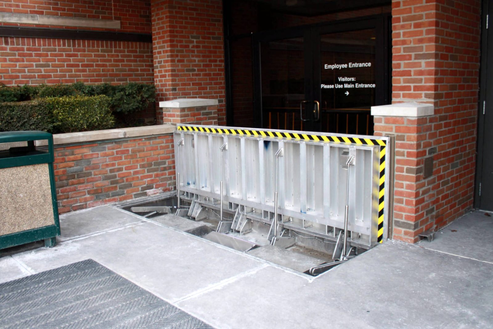 - Flood barriers that automatically raise into place when floodwater reaches an entrance below the design flood elevation, allowing for immediate deployment without human intervention