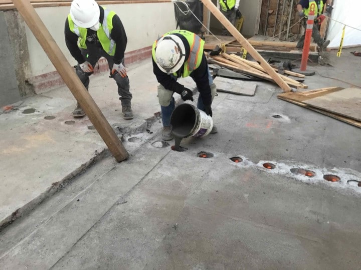 - Adding fiber-reinforced polymer to create new seismic force collectors and strengthen existing collectors to transfer the third-floor diaphragm forces into the concrete walls