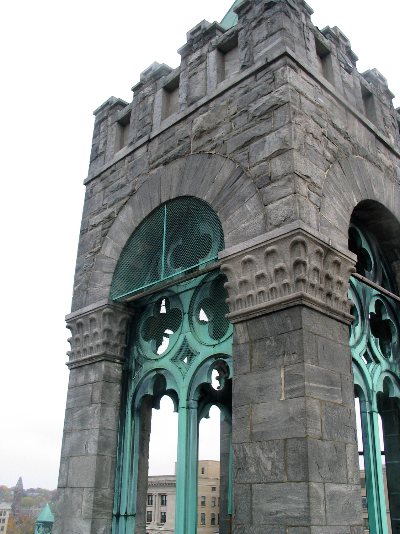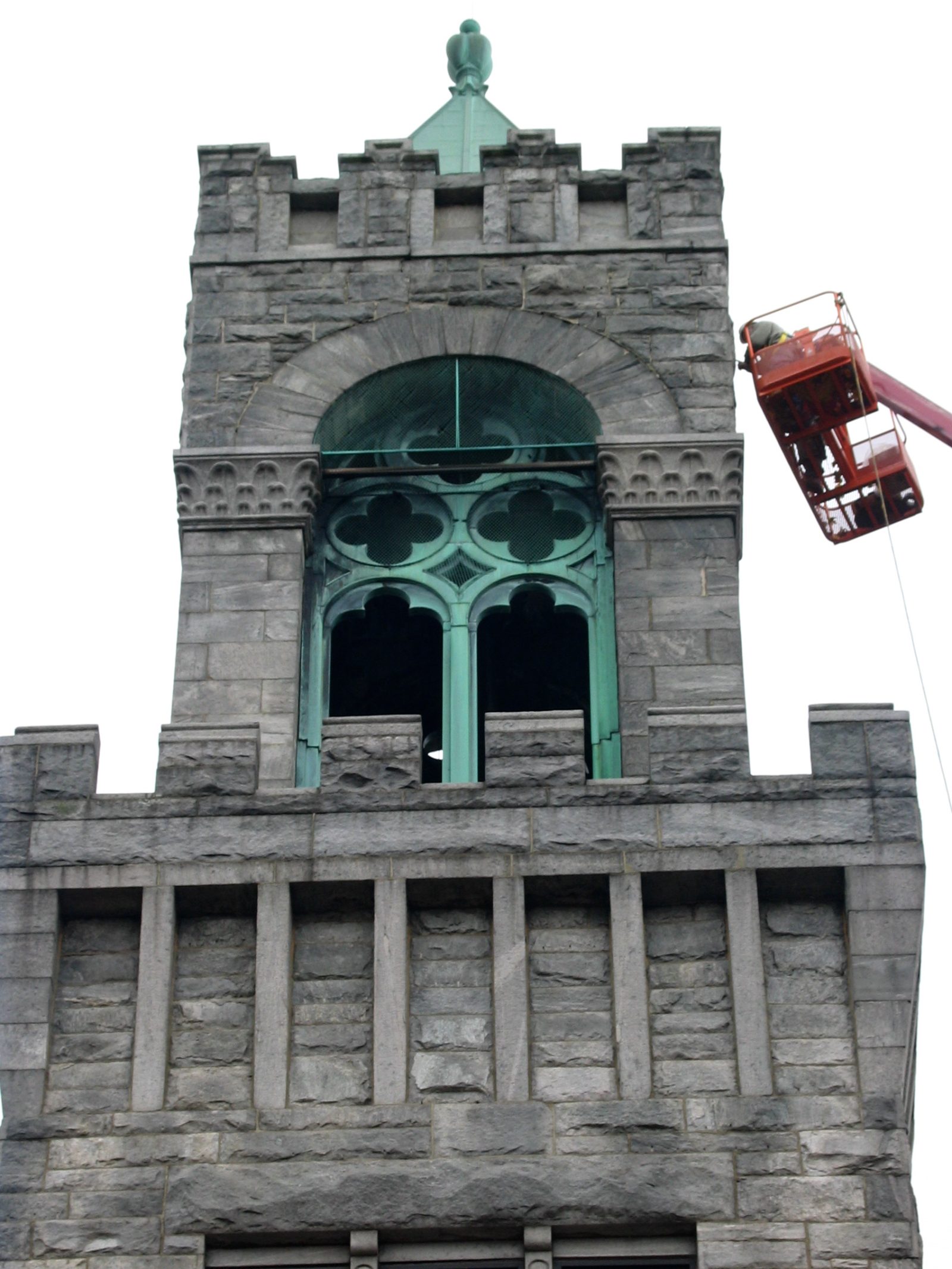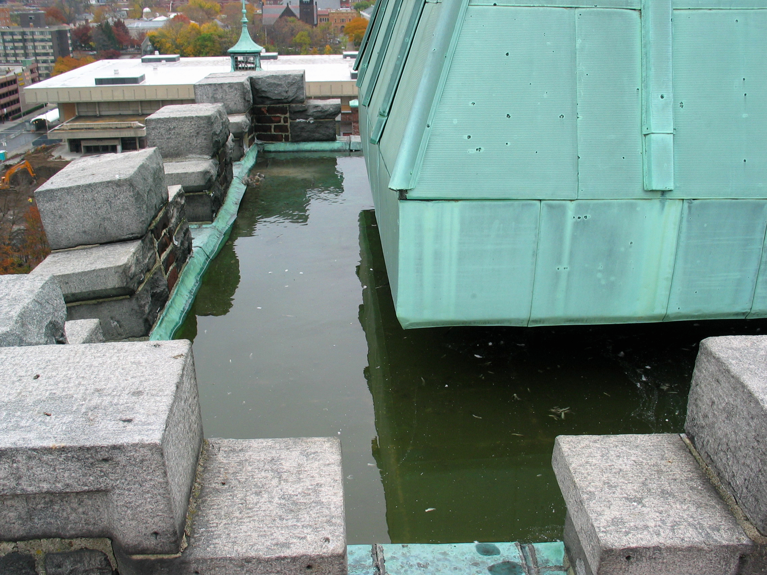 - Replacing leaky tower roofs, and installing a sloped copper cap on the chimney to eliminate the sources of water that caused masonry deterioration of the chimney and tower