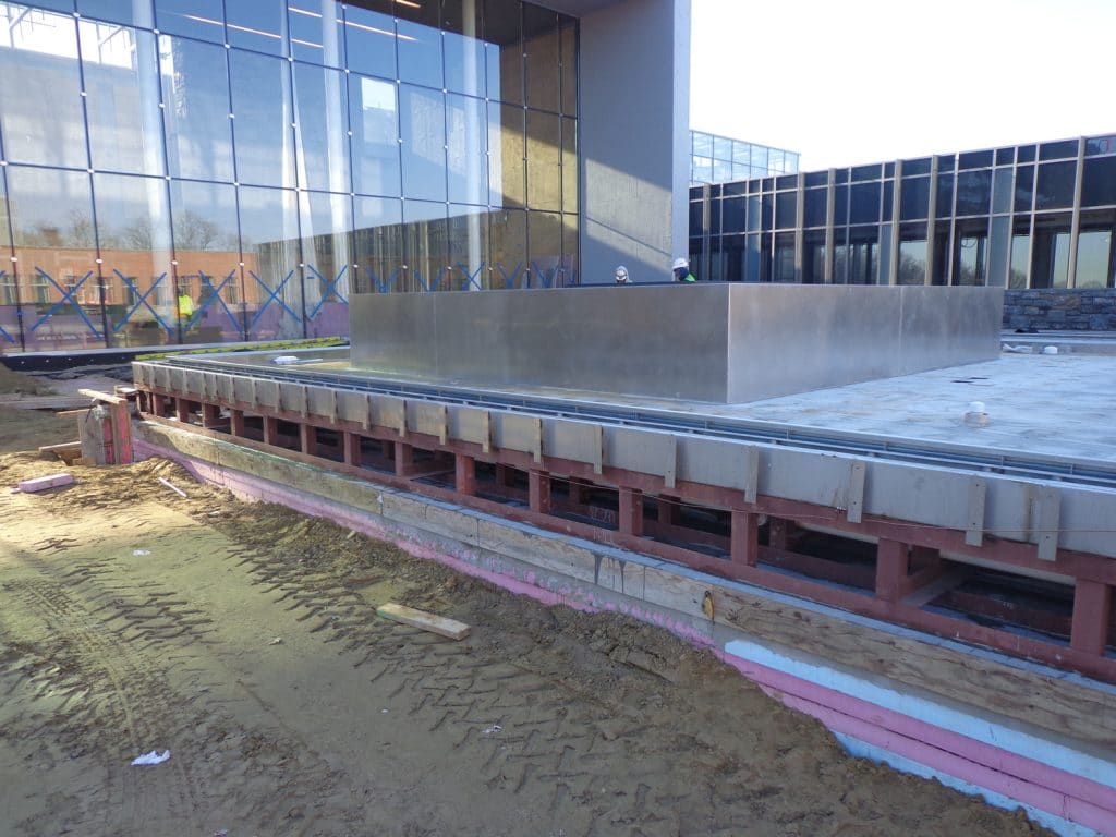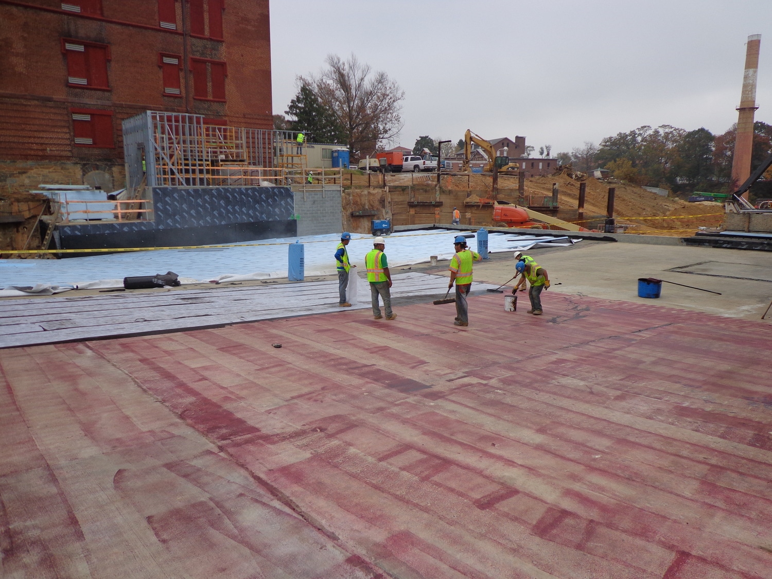 - Establishing continuity of below-grade waterproofing across interconnected building segments with irregular footprints on a sloped building site