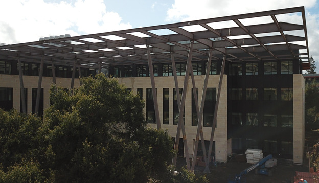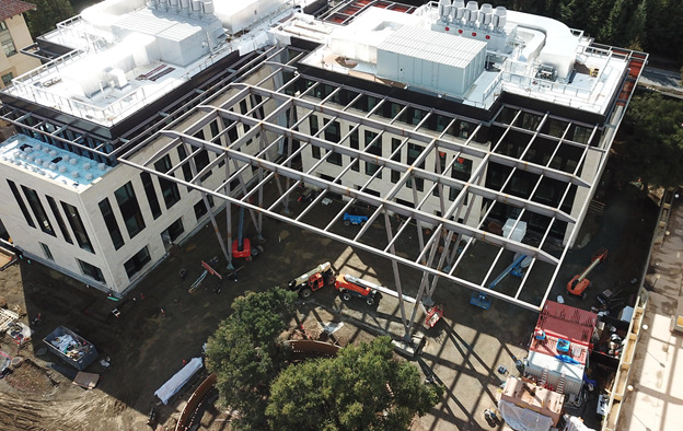The Anne T. and Robert M. Bass Biology building includes laboratory space, classrooms, offices, and research areas for Stanford University’s Biology Department. Designed to promote collaboration, the five-story building features a 65 ft tall exposed structural steel canopy over an inviting outdoor space for work or relaxation. SGH provided construction engineering services to the steel fabricator/erector for the erection of the signature canopy.