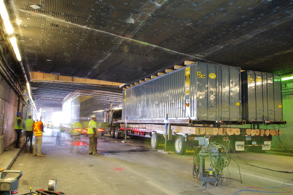 SGH collaborated with the building owner and construction manager to develop a controlled demolition plan that would minimize risks to the building above and traffic below. During nightly lane closures, the construction team installed temporary shoring, including supplemental steel hangers and steel support beams, to facilitate saw cutting dozens of manageable pieces, approximately 300 sq ft each. During weekend tunnel closures, the contractor cut the hangers and lowered the pieces onto trucks rigged with shipping containers ready to receive and transport the pieces.