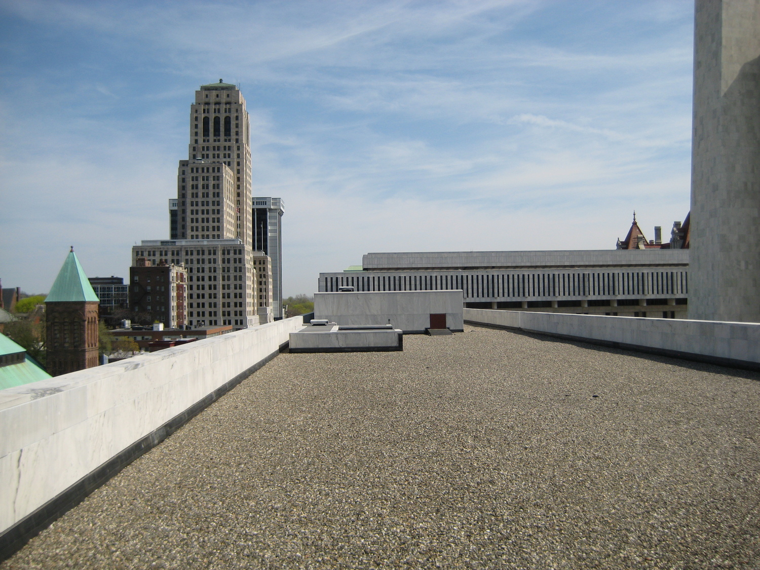 The Swan Street Building, constructed in 1968, is one of the properties that anchors the end of the Empire State Plaza. The 117,500 sq ft building is a five-story marble-clad structure with multi-level, low-slope roofs. The existing roofing system was nearing the end of its useful life and water leakage into the building interior caused damaged to interior finishes.