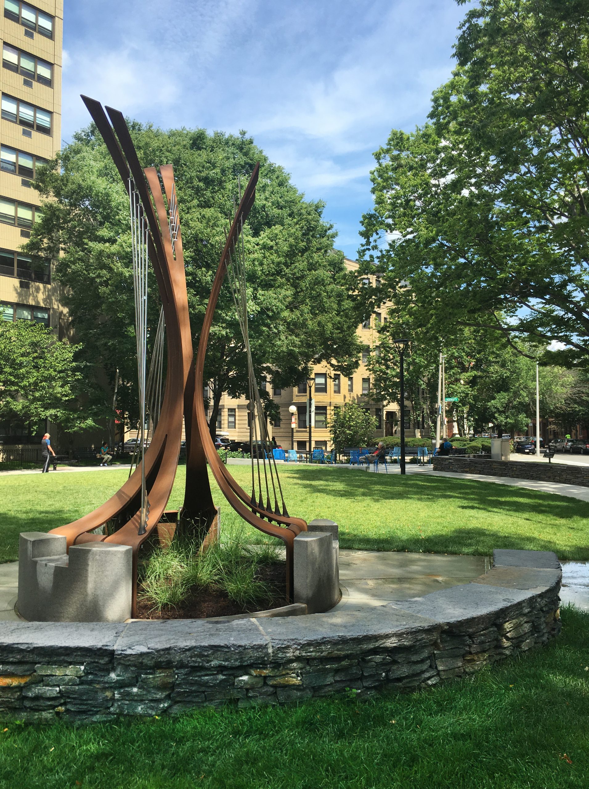 As part of Symphony Park’s redesign, the Boston Parks and Recreation Department collaborated with the Boston Art Commission and the Friends of Symphony Park to select Jacob Kulin to design a sculpture for the park. Celebrating the nearby Berklee College of Music and Symphony Hall, Kulin’s design embraces the shapes of string instruments in his modern Scandinavian style. SGH consulted on the structural design for the 16 ft tall sculpture, First Chair.