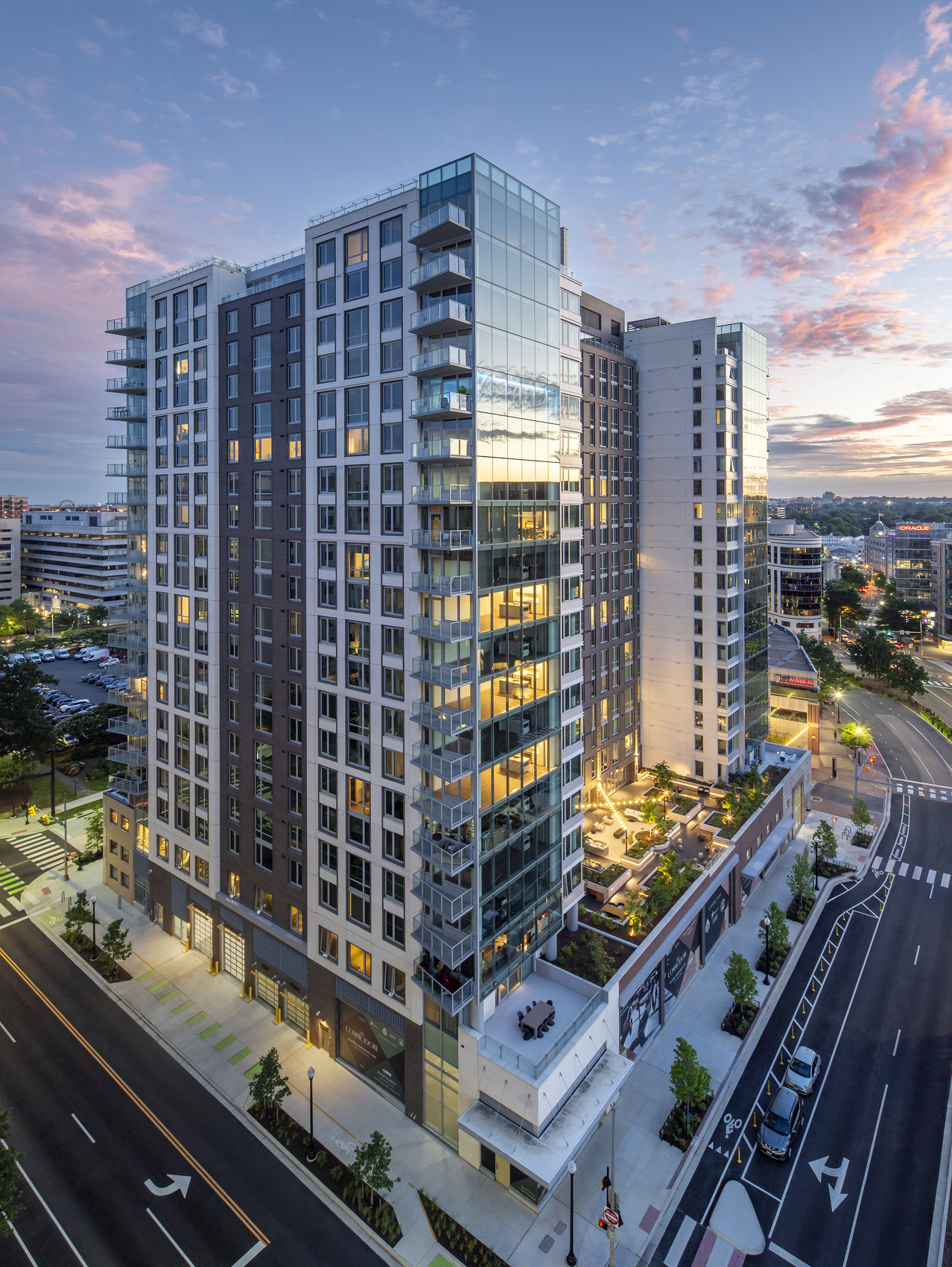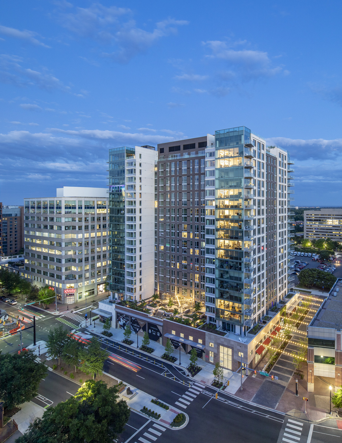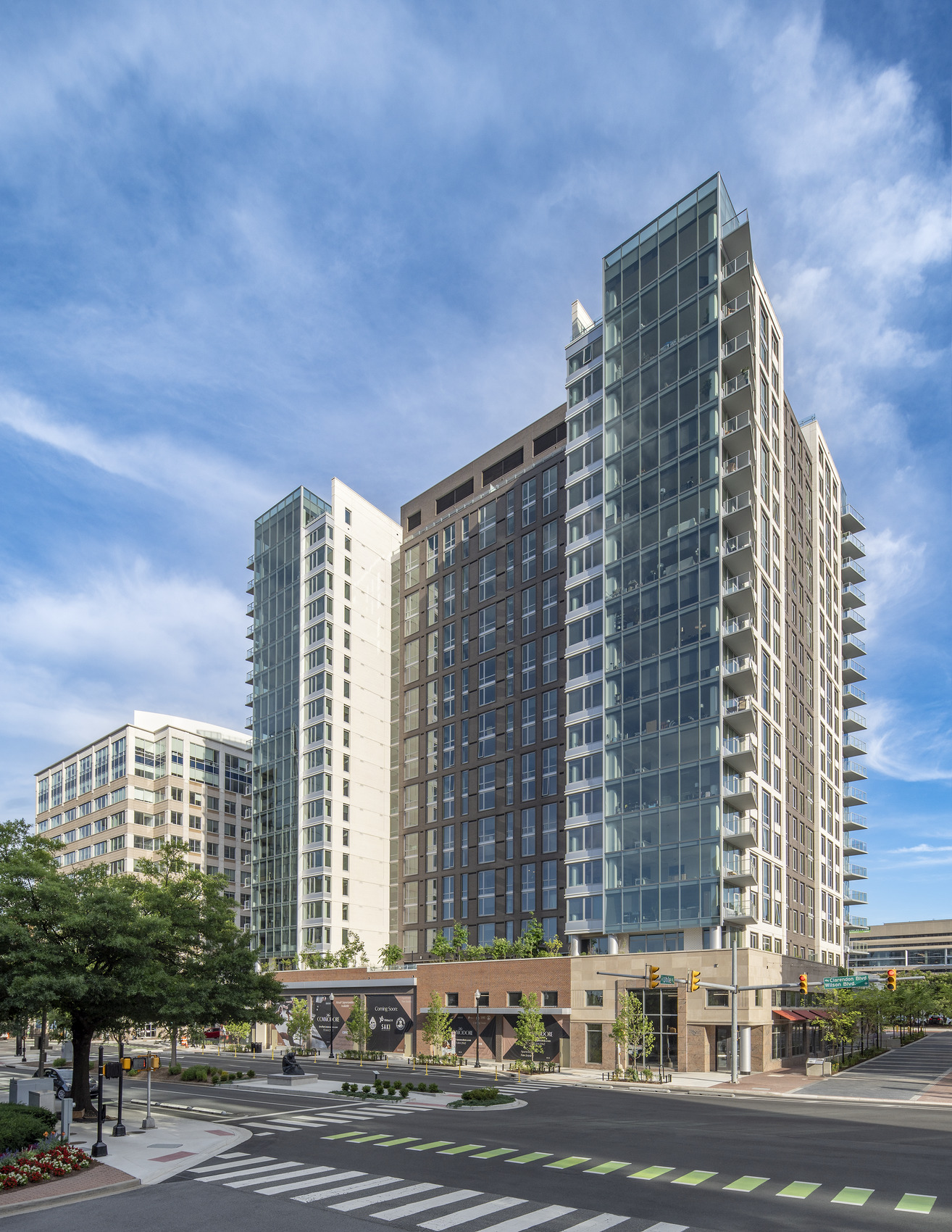 Located in the ten acres defined as Courthouse Square and directly adjacent to an Orange Line Metro station, The Commodore includes more than 400 apartment units and ground-level retail. Residents enjoy many amenities, such as private balconies, an expansive fitness center, community lounges, a third‑floor terrace with a swimming pool, and a rooftop amenity deck. SGH consulted on the building enclosure for the project, which incorporates facades from the original buildings along Clarendon Boulevard into the new tower.
