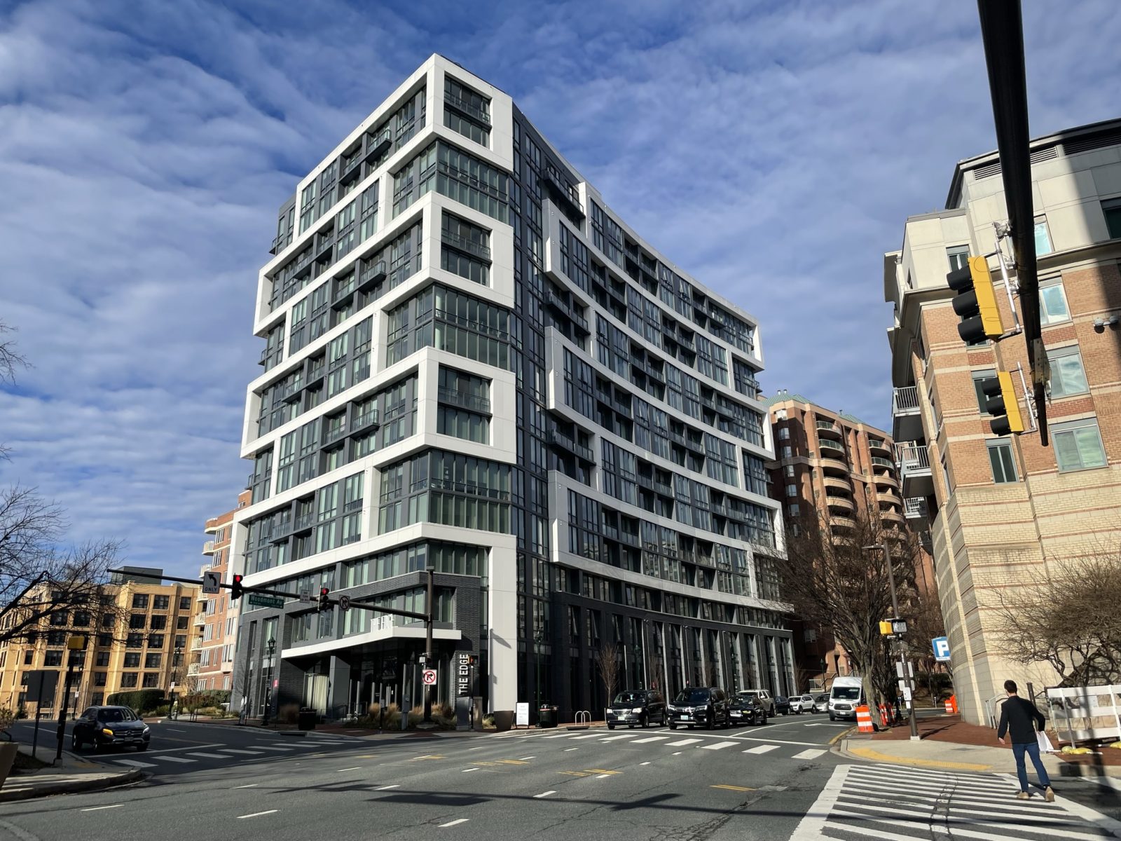Located in downtown Bethesda, Maryland, The Edge is a fifteen-story residential development with 154 rental units and amenities, such as a fitness center, rooftop lounge and terrace, and below-grade parking. The new tower is connected to the existing adjacent building with an elevated walkway and through the below-grade parking garage. SGH consulted on the building enclosure design for the project, which features large white frames accenting the offsets in the facade.