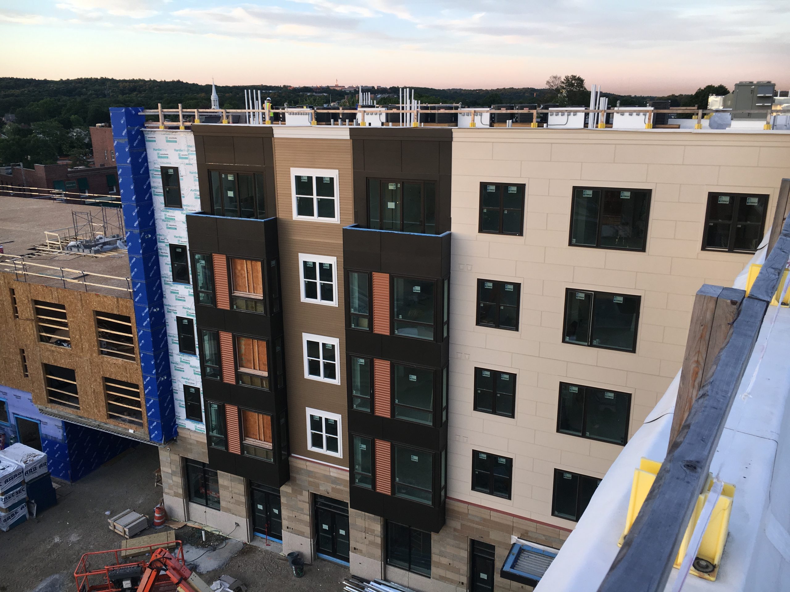 - Exterior wall assemblies with brick masonry, fiber-cement, and metal panel cladding systems; punched composite windows; first floor aluminum storefront systems; sheathing; air/vapor/water barriers; and light-gage steel and wood stud wall framing