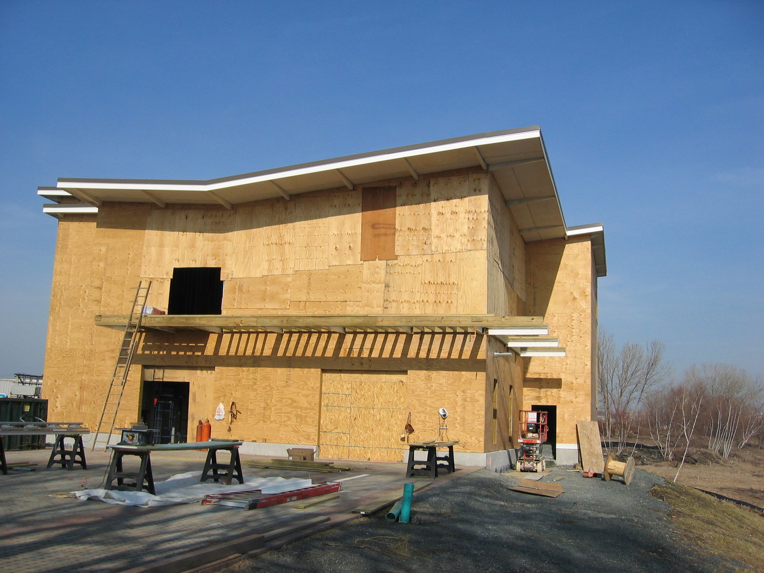 The boat house features a sloping butterfly roof that culminates at a 14 ft tall glass wall overlooking the river. The design exposes and emphasizes the roof framing and overhanging eaves. With the complexity of the dual slope butterfly roof and floor and roof projections that cantilever up to 6 ft from the building face and wrap the corners, the roof structure required clever structural design and detailing efforts.