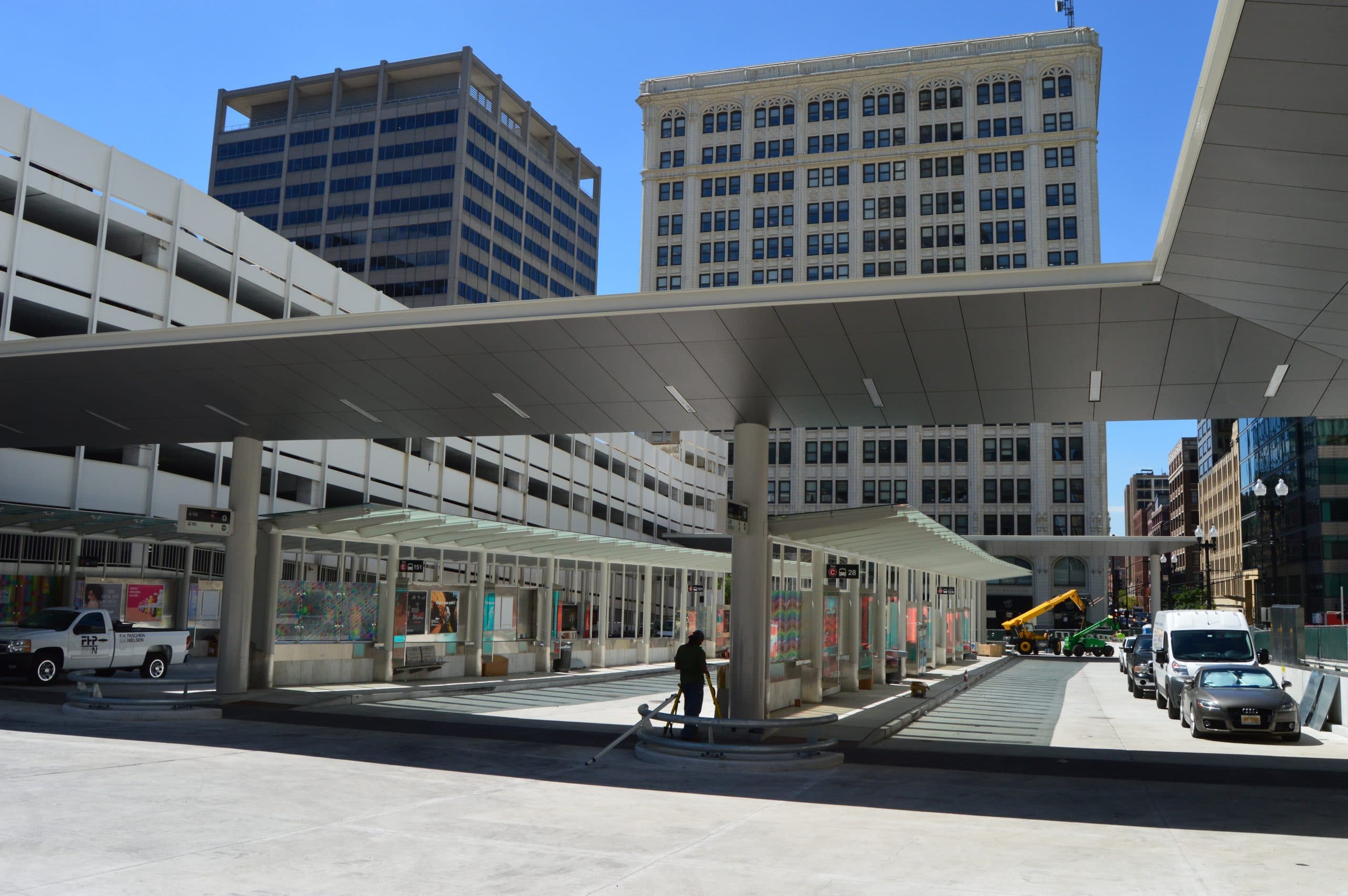 The transit center features free-standing canopies cantilevering over the bus terminal shielding passengers from the weather, while allowing sunlight to pass through. Two overhead canopy structures cross over the ends of the three bus canopies. Passengers coming from Union Station enter the transit center through a building below the east crossover canopy.