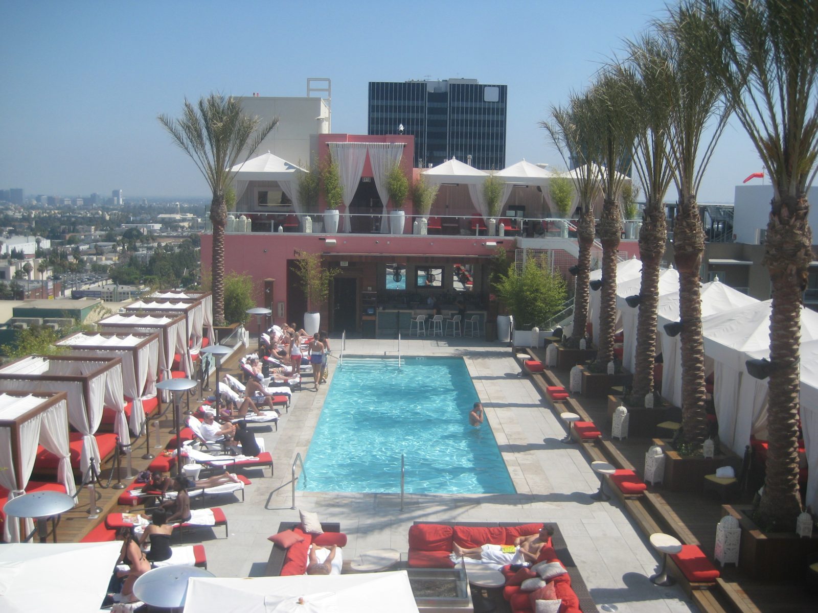 The eleven-story hotel and fourteen-story residence tower are clad with multiple systems, including cement plaster, stone, composite metal panels, and precast panels incorporated with aluminum punched windows, storefront windows, and curtain walls. The buildings feature several terrace areas; private balconies at residences; accessible roof decks with pools, spas, bar areas, and seating; and low-slope roofing around pool decks.