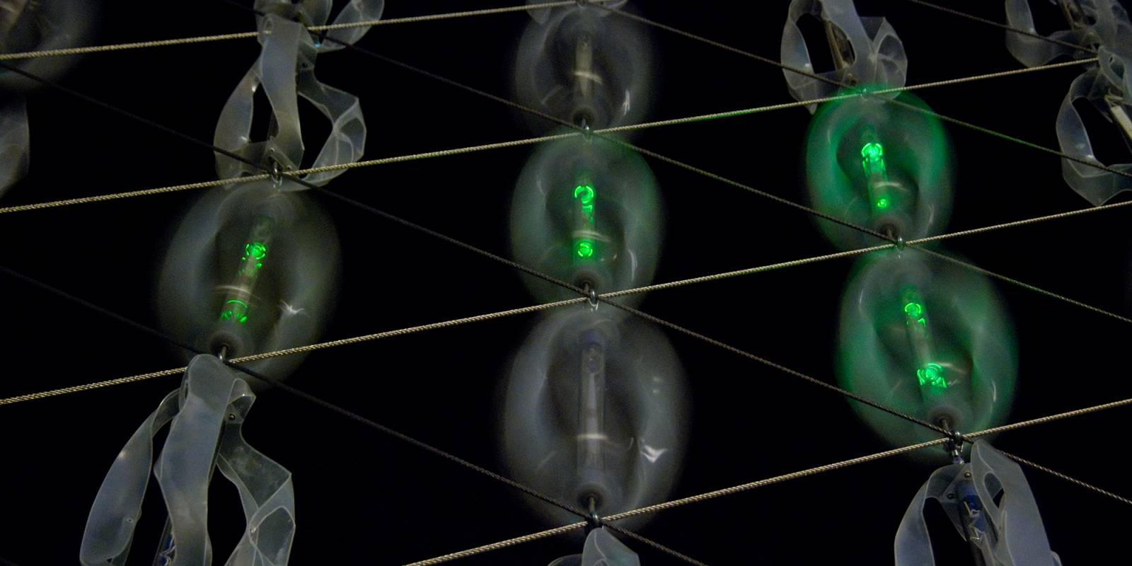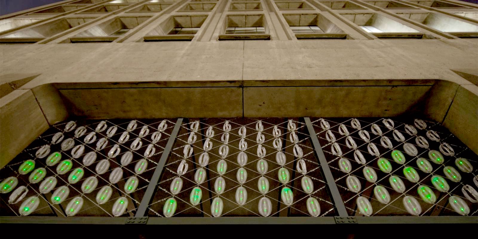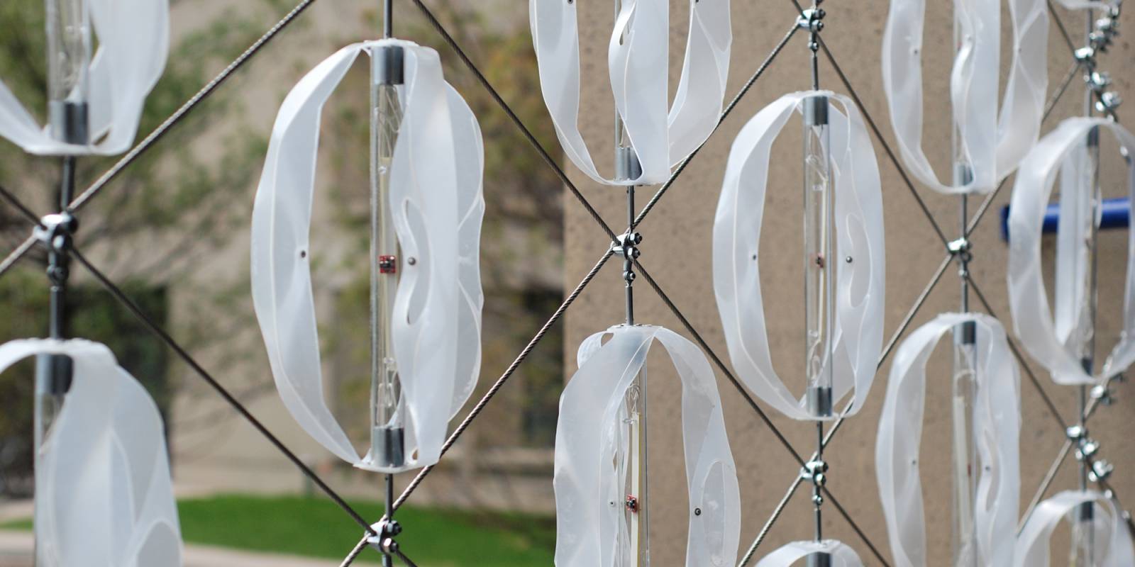 Windscreen, a grid of small turbines suspended in a vertical cable net, was temporarily located on the southern facade of I. M. Pei’s Building 54. By spinning, the turbines powered integrated LED lighting creating a visual response to the wind.