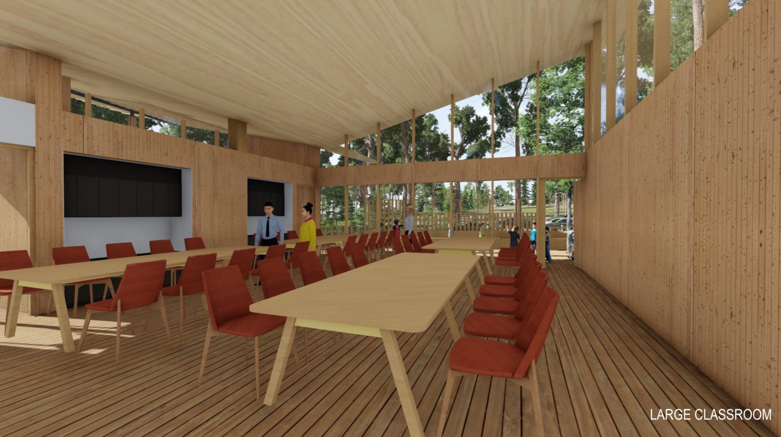 - Structural columns integrated with the glass facade, allowing natural light into the classroom spaces