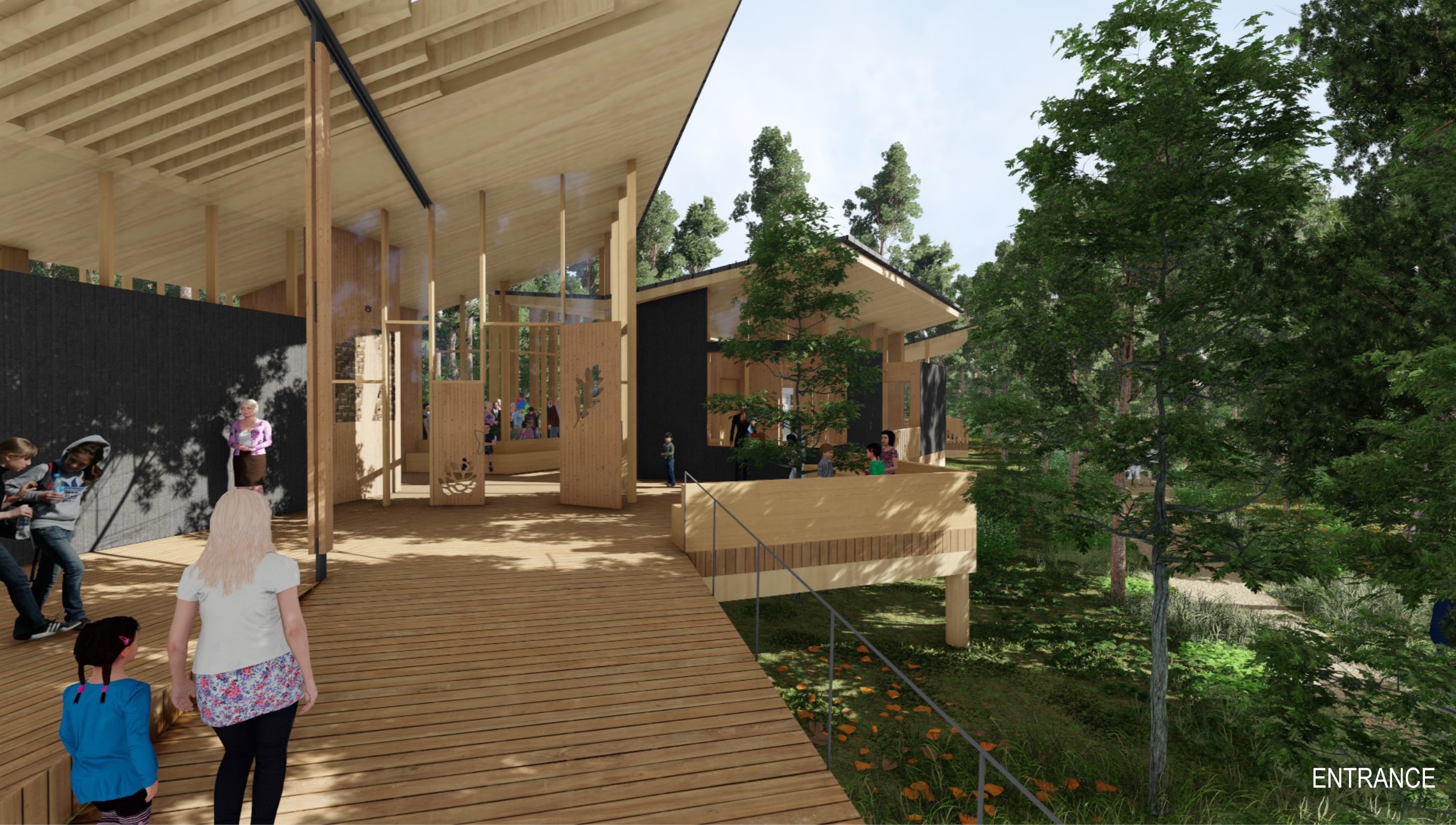 - Cantilevering roofs constructed with point-supported, cross laminated timber (CLT) to create the butterfly shape